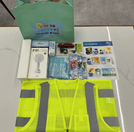 ‘폭염 안전물품 꾸러미’는 재사용이 가능한 가방에 휴대용 선풍기, 형광 망사 안전조끼, 양우산, 쿨스카프, 쿨패치, 벌레약, 식염포도당, 자전거 후미등 등 9가지 물품과 폭염 행동요령 소책자가 담겨있다.