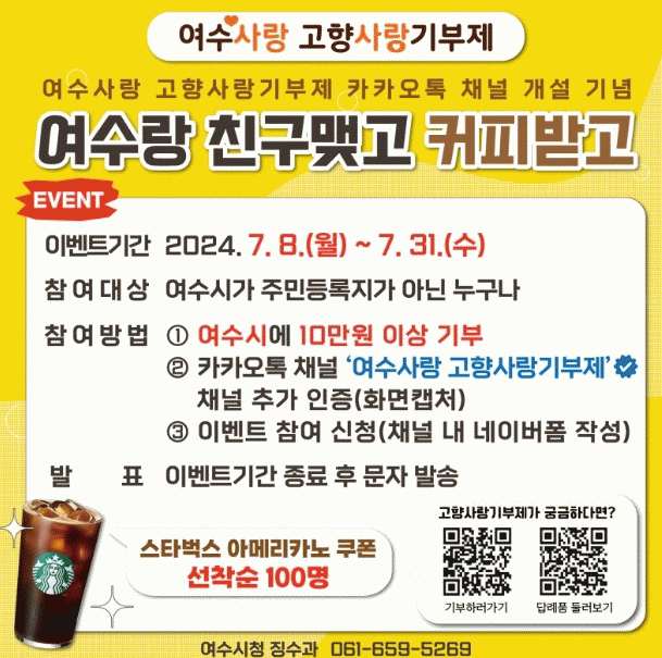 시 관계자는 “카카오톡 채널을 통해 활발히 소통하며 기부 혜택을 적극적으로 알리겠다”며 “앞으로도 여수시 고향사랑기부제 확산에 많은 관심과 참여를 부탁드린다”고 전했다.