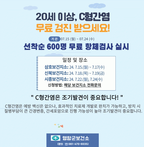 영암군보건소 관계자는 “영암군민의 건강과 지역사회의 위생에 심각한 영향을 미칠 수 있는 C형간염을 예방하도록 무료 항체검사에 많은 관심과 참여 바란다”고 전했다.