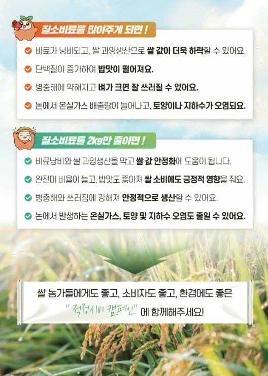 질소질 비료 10a 당 9kg의 적정 시비는 이 모든 문제를 개선함과 동시에 과도한 화학비료 사용에 따른 토양오염 방지, 온실가스 배출 감축 등 지속가능한 미래 농업 실현에도 도움이 된다.