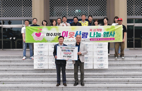 이기연 여수양계협회 회장은 “작은 나눔이 더 큰 보람으로 돌아오는 기쁨”이라며 “영양 가득한 삼계탕을 드시고 건강하게 여름을 나시길 바란다”고 후원 소감을 밝혔다.
