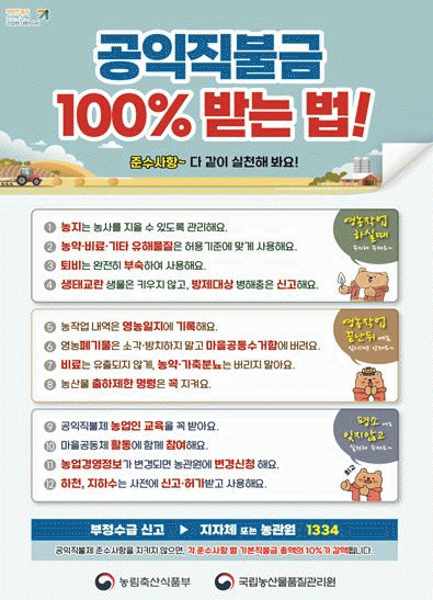 직불금을 100% 받기 위해서는 농가가 법령에서 정한 17가지 의무 준수사항을 모두 실천해야 한다.