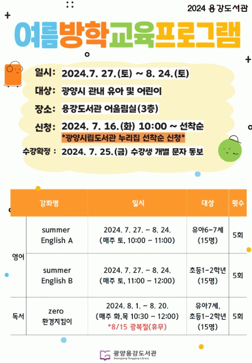 이번 프로그램은 광양시 어린이(유아 6 부터 7세) 15명, 초등학생(1 부터 2학년) 30명을 대상으로 하며 7월 27일부터 8월 24일까지 진행된다.