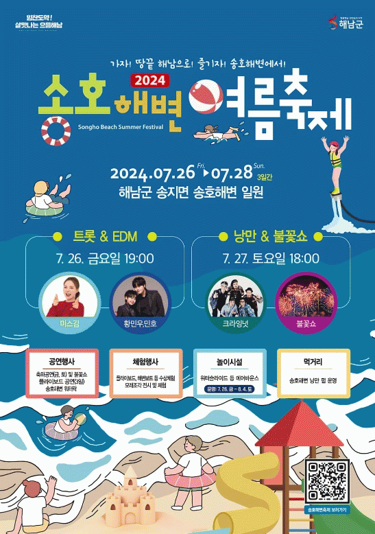 군 관계자는 “땅끝마을의 청정 바다에서 낭만과 쉼이 있는 재충전의 시간이 될 수 있도록 다양한 프로그램을 준비했다”며“남도 대표 휴양지인 송호해변에서 온 가족이 함께하며 잊지 못할 추억을 남기고 가시길 바란다”고 전했다.