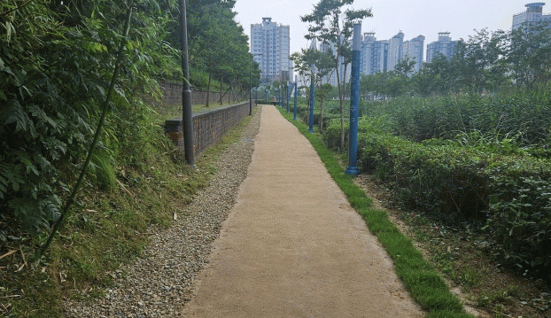 대죽도 근린공원 어싱길은 길이 1.1km, 폭 1.9m의 마사토 포장길로 조성했고, 세족장과 신발 보관함 등 편의시설을 갖췄으며, 경관배수로 위를 지나가는 목교에는 인조 잔디를 설치하여 쾌적하고 안전한 보행 환경을 제공했다.