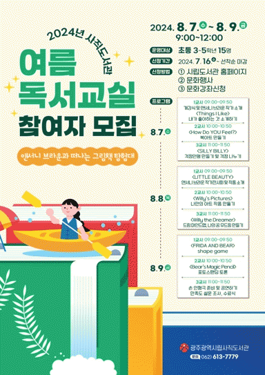 송경희 시립도서관장은 “여름 독서교실을 통해 어린이들이 자기주도적 독서습관 형성과 도서관을 친숙한 놀이공간으로 여기고 독서활동의 즐거움을 알아가길 바란다”고 말했다.