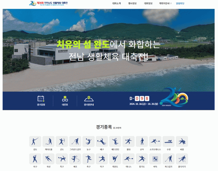 홈페이지는 ▲대회 소개(개요, 경기장 안내 등) ▲행사 정보(개회식, 폐회식 등) ▲대회 정보(경기 종목, 일정 등) ▲개최지 안내(완도 관광 해양치유 등) ▲알림 마당(공지사항, 이벤트) 등 5개 메뉴로 구성됐다.