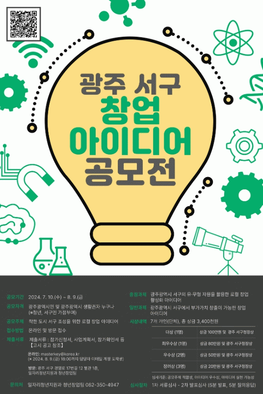 공모는 ▲서구의 유·무형 자원을 활용한 로컬 창업 활성화 아이디어(중점과제) ▲서구에서 부가가치 창출이 가능한 창업 아이디어(일반과제) 로 나뉘어 진행된다. 광주광역시민 및 생활권자 누구나 참여 가능하며, 중점과제로 참여할 경우 가점이 부여된다.