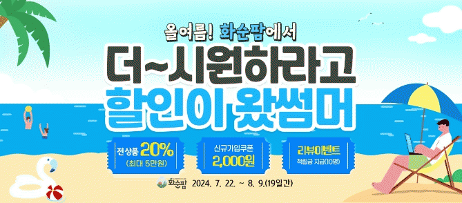 할인 이벤트로 화순팜 회원에게 전 상품 20% 할인 쿠폰(최대 5만 원)과 신규 회원에게는 2,000원 할인 쿠폰(500명)을 추가로 지급한다.