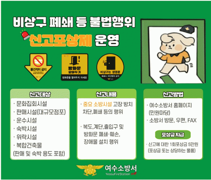 박원국 서장은“비상구 등 피난시설 확보를 위한 신고포상제가 인명피해 최소화에 도움이 될 거로 생각한다”라며 “시민의 경각심을 고취하고 안전의식을 확산하기 위한 취지이므로 많은 동참을 부탁드린다”라고 당부했다.
