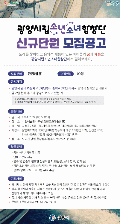 광양시립소년소녀합창단 신규단원 모집 관련 자세한 사항은 광양시 홈페이지 공고란이나 문화예술과로 문의하면 된다.