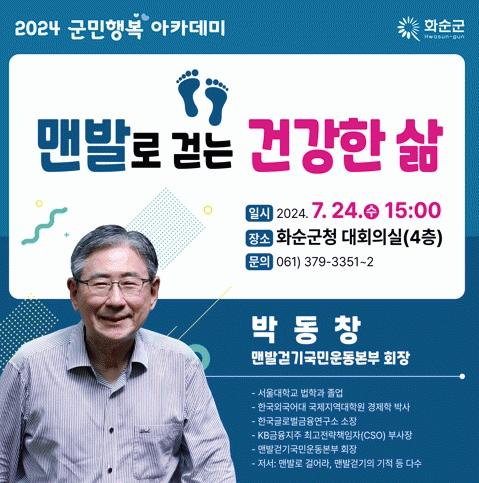 조미화 인구청년정책과장은“이번 강연을 통해 지자체마다 황톳길 조성 등 전국적으로 열풍이 불고 있는 맨발걷기 운동에 대해 더 자세히 알아보고, 건강한 삶을 영위하는 방법을 배우는 계기가 될 것 같다.”라며 “군민 여러분의 많은 관심과 참여 부탁드린다”라고 전했다.