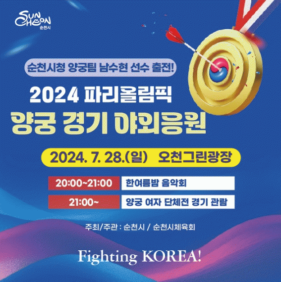 순천시에서는 파리올림픽 양궁 단체전이 열리는 7월 28일 오천그린광장에서 시민들의 염원을 담아 응원전을 개최한다.