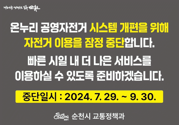 다만, 차세대 시스템 구축 기간 내 자전거 이용 시민들의 안전을 위해 오는 7월 29일부터 약 2개월간 한시적으로 ‘온누리’ 공영자전거 서비스 이용이 중단된다.