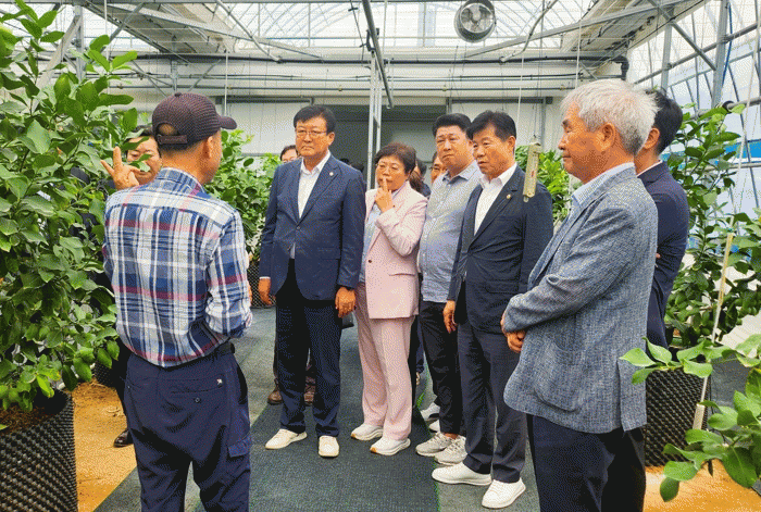 이날, 삼서면 삼계리 소재 레몬 재배농가를 찾은 전남도의회 농수산위원회 위원들은 현지 농업인들로부터 애로 및 건의사항을 듣고, 아열대작물 재배 현장에 필요한 행정적 지원에 대해 의견을 나눴다.