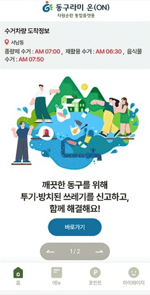 한편 지난 3월 산수동에 개관한 친환경자원순환센터와 함께 구축한 자원순환 통합플랫폼 ‘동구라미 온(ON)’은 주민의 자원순환 생활을 돕기 위해 청소차 도착 정보, 스마트 수거함 지도, 쓰레기 해결단 등 다양한 기능과 정보를 통합 제공하고 있다.