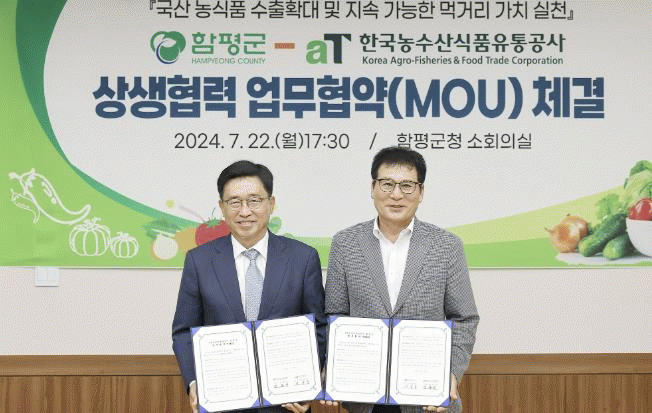 군은 이날 협약식에서 함평군 농산물 판로 확보를 위한 수출 지원을 건의하고 아울러 지속가능한 지구 및 인류의 미래를 위해 저탄소 식생활 캠페인에 적극 동참할 것을 약속했다.