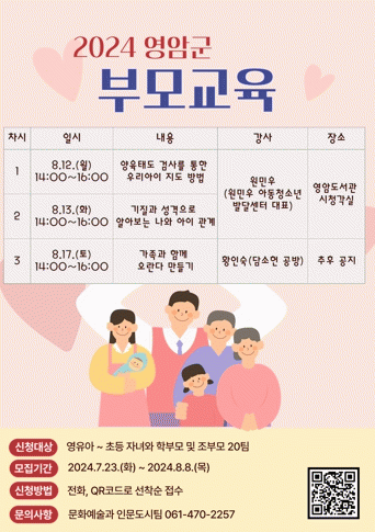 교육 신청은 8월 8일까지 전화와 QR코드로 신청할 수 있고, 자세한 안내는 영암군 인문도시팀에서 한다