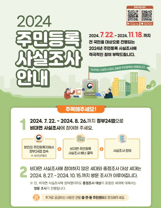 올해 주민등록 사실조사는 지난 22일 시작되어 오는 8월 26일까지는 비대면-디지털 조사(이하‘비대면조사’)로 진행되고, 이후에는 통장 및 동 담당 공무원이 거주지를 방문해 직접 거주 여부를 확인하는 방문 조사로 진행된다.