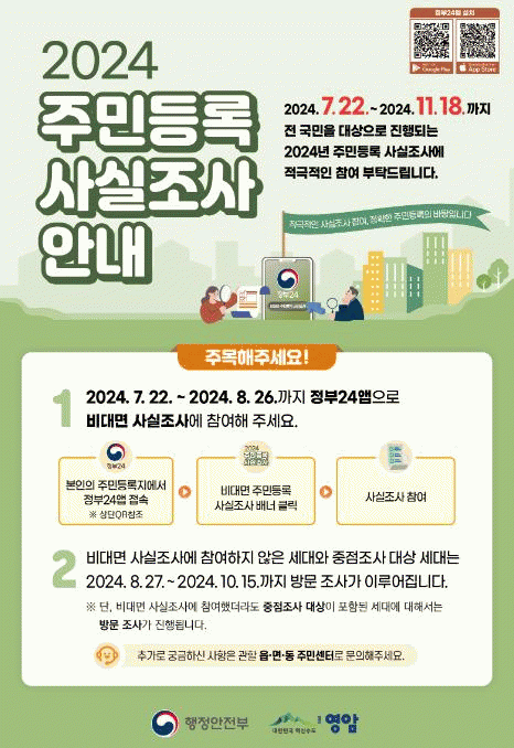 비대면 조사는 영암군민이 본인의 주민등록지에서 ‘정부24’ 앱에 접속한 다음, 사실조사 사항에 응답하는 방식으로 진행된다.