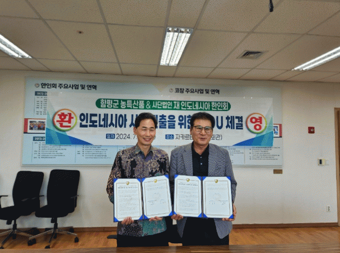 전남 함평군은 26일 2024 인도네시아 국제식품박람회(Food · Hospitality Indonesia, FHI)가 개최되는 자카르타 소재 인도네시아한인회 사무실에서 (사)재인도네시아한인회(회장 박재한)와 함평 우수 농특산품의 인도네시아 시장 진출 협력을 위한 MOU를 체결했다고 밝혔다.