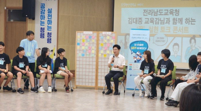고유미(함평해보중 1학년) 학생은 “어떻게 철학과에 들어가셨나요?”라고 질문하자, 교육감은 “어렸을 때부터 책을 많이 읽고 삶의 가치와 사회문제에 관심이 있다보니 자연스럽게 철학과에 진학하게 됐다.”고 답했다.