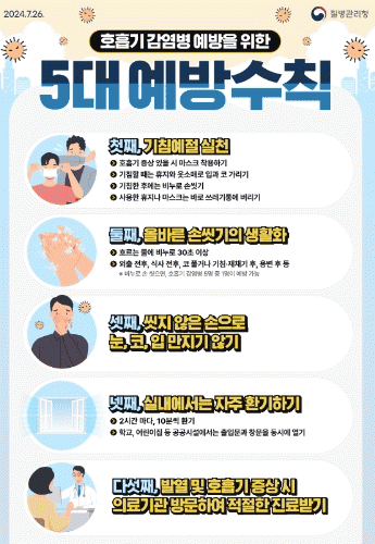 호흡기 감염병을 예방하기 위해서는 ▲기침 예절 실천(기침할 때에는 옷소매로 가리기), ▲올바른 손 씻기(흐르는 물에 비누로 30초이상 씻기), ▲씻지 않은 손으로 눈·코·입 만지지 않기, ▲실내에서는 자주 환기하기(2시간마다 10분씩 환기), ▲발열 및 호흡기 증상 시 바로 의료기관 방문하기 등 5대 예방수칙을 준수해야 한다.