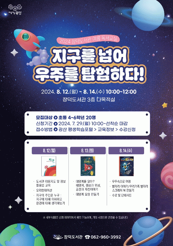 여름방학 독서 교실은 선착순으로 20명을 모집하며, 신청 방법은 광산평생학습포털(edu.gwangsan.go.kr)에서 로그인 후 하면 된다.