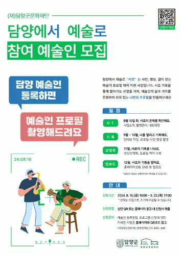 프로그램은 담양군문화재단 홈페이지에 예술인 DB 등록 서비스에 신청 중이거나 등록 완료된 예술인은 누구나 참여할 수 있으며 신청은 8월 16일 금요일부터 선착순으로 모집한다.