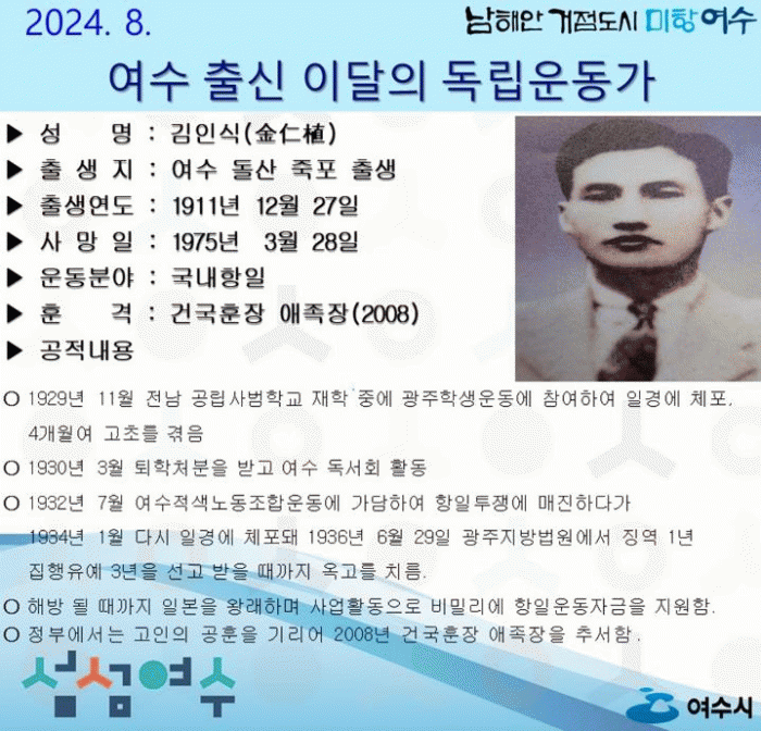 시 관계자는 “조국을 위해 희생하신 독립운동가 덕분에 지금의 대한민국, 여수가 존재한다”며 “우리 지역 독립운동가를 잊지 않고 기억할 수 있도록 공훈을 알리는 데 더욱 힘쓰겠다”고 밝혔다.