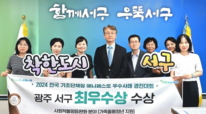 서구는 한국매니페스토실천본부와 경남연구원이 공동 주최한 ‘2024 전국 기초단체장 매니페스토 우수사례 경진대회’에서 가족돌봄청년수당 및 주민참여형 동행복지정책으로 사회적불평등 완화 분야 최우수상을 수상했다고 1일 밝혔다.
