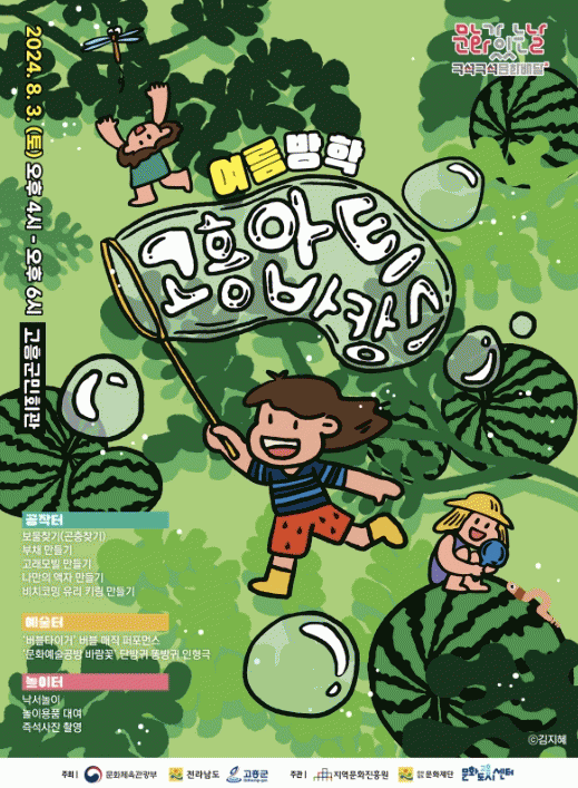 지난 6월 29일 열린 ‘고흥아트바캉스-영웅’은 호국보훈의 달을 맞이해 나라를 위해 희생하는 직업군을 위한 감동적인 행사였다면, 이번 8월 3일 고흥 군민회관에서 펼쳐질 세 번째 고흥아트바캉스는 ‘여름방학’을 주제로 어린이를 대상으로 신나고 재미있는 문화예술 프로그램을 마련한다.