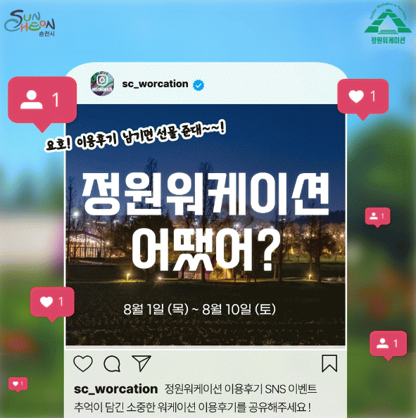 시 관계자는 “이번 이벤트는 SNS를 통해 여행 정보를 얻는 소비트렌드에 착안하여 진행하게 됐다”며, “이용자의 생생한 후기를 접하고 많은 분들이 정원워케이션을 찾아주시길 기대한다”고 말했다.