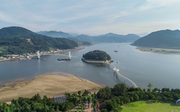 소나무가 운치 있게 뻗어 있는 섬 정상의 해운정에 오르면 쉼 없이 흐르는 섬진강과 망덕포구는 물론 강 건너 하동까지 한눈에 들어온다.