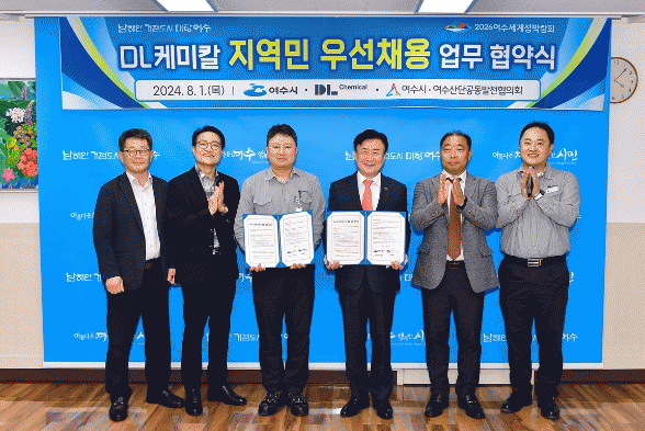 지난 1일 오후 시장실에서 열린 협약식에서 DL케미칼은 산단 내 지역 청년 취업률 제고를 위해 합리적인 여수시 청년 우대제도를 마련하고 신규 인력 채용 시 적극 반영하기로 했다.