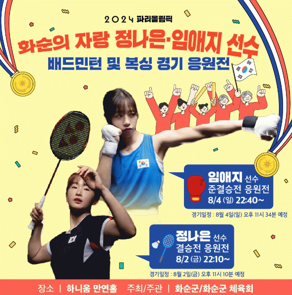 화순군과 화순군 체육회는 하니움 만연홀에서 2일 밤 10시 10분부터 정나은 선수의 배드민턴 결승전을, 4일 밤 10시 40분부터 임애지 선수의 복싱 준결승전 응원전을 펼칠 계획이다.