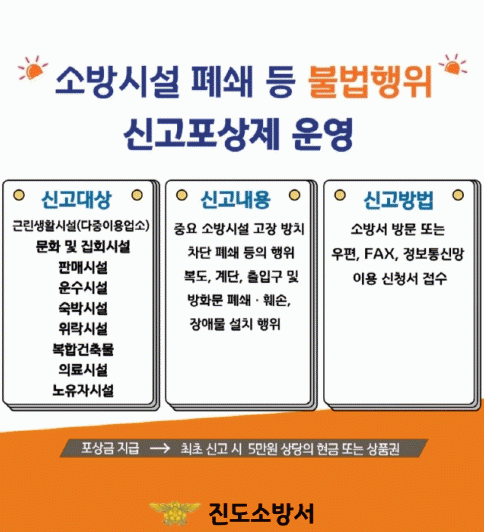 최초 신고 시 신고자에게 5만원(현금 또는 전통시장 온누리상품권), 같은 신고인이 2회 이상 신고 시 소화기 ‧ 단독경보형 감지기 등 5만원 상당의 소방시설을 지급하며 동일한 사람의 신고에 대한 포상금은 월간 30만원, 연간 300만원 이내로 포상을 받을 수 있다.
