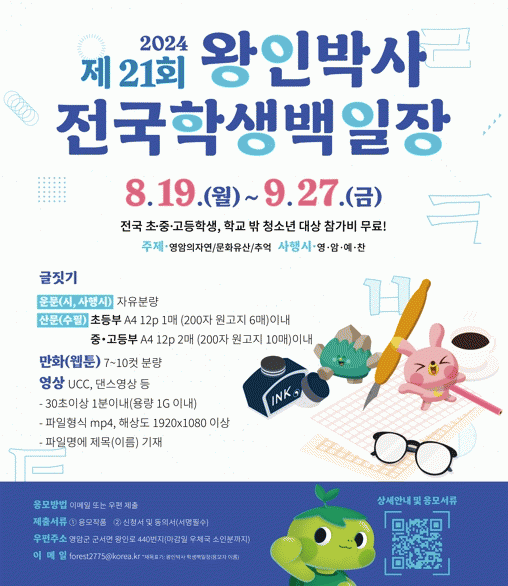 작품 응모는 이메일과 우편(영암군 군서면 왕인로 440)으로 할 수 있고, 백일장에 대한 자세한 내용은 영암군홈페이지 ‘공지사항’에서 볼 수 있다.