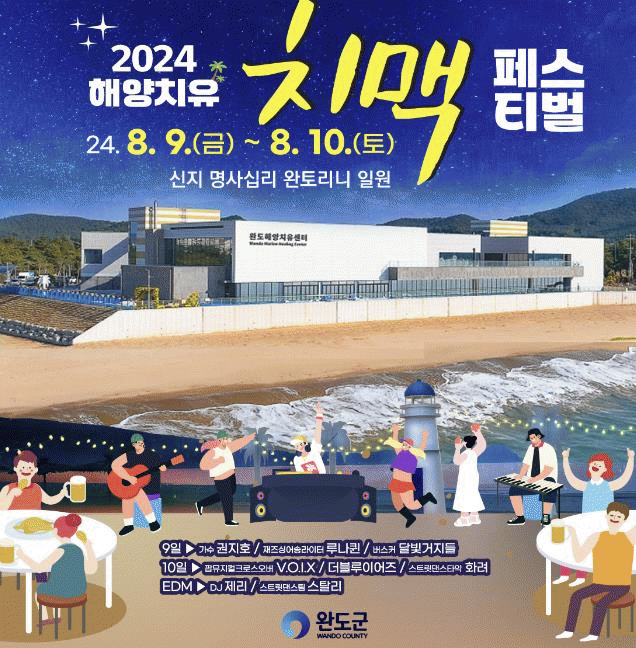 군 관계자는 “일상 속 지친 몸과 마음을 치유할 수 있는 완도해양치유센터와 청정한 해변이 있는 신지 명사십리는 여름철 최고의 휴양지이다”면서 “해양치유 치맥 페스티벌과 함께 완도에서 무더위를 날려버릴 특별한 추억을 만들기를 바란다”라고 말했다.