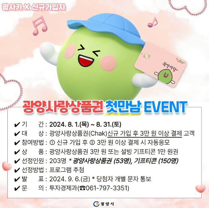 광양시는 소비가 많은 여름 휴가철인 8월에 이번 이벤트를 진행해 광양사랑상품권 신규가입자를 유입시키고 지역경제를 활성화한다는 구상이다.