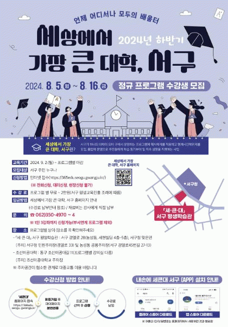 프로그램 신청은 ‘세상에서 가장 큰 대학 서구’ 누리집 및 ‘내 손에 세큰대 서구’ 앱(APP)을 통해 가능하며 수강료는 프로그램별 무료에서 1만원까지이고 재료비는 개인 부담이다.