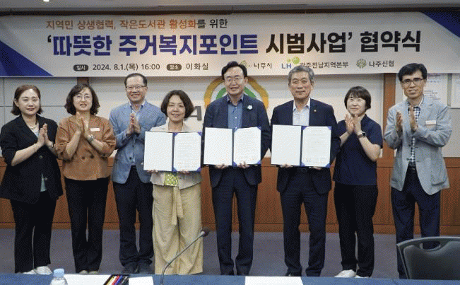 이번 협약식에는 윤병태 나주시장, 정수미 LH광주전남지역본부장, 최길주 나주신협 이사장 등이 참석했다. 협약 내용은 ‘지혜마루 작은도서관’ 활성화 상호 협력과 주거복지포인트 재원 마련 등을 담고 있다.