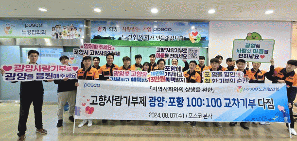 포스코 노경협의회 주관으로 열린 이번 행사는 직원들에게 고향사랑기부제의 취지와 기부자 혜택, 참여 방법 등을 안내하고 양 제철소 간 100:100 교차 기부를 다짐하기 위해 직원들과 기념사진을 촬영하는 순서로 진행됐다.