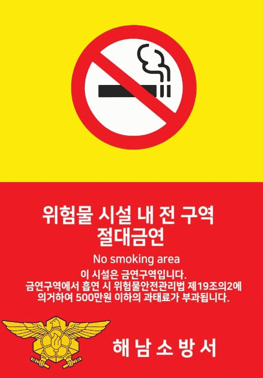 소방서에서는 지난달 31일을 기해 개정안이 시행에 들어간 만큼 ▲위험물제조소등 시설 내 흡연금지 ▲ 위험물제조소 등 금연구역 알림표지 설치 ▲위반할 경우 최대 500만원 이하의 과태료 부과 등 관련내용을 관내 위험물제조소등 관계인에 적극 홍보하고 있다.