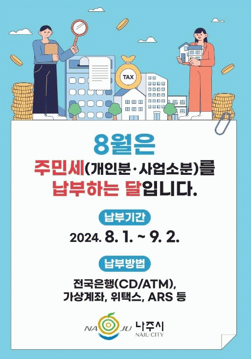 8월 주민세 개인분은 7월 1일 현재 나주시에 주소를 둔 개인(세대주)에게 교육세를 포함한 1만1000원을 부과한다.