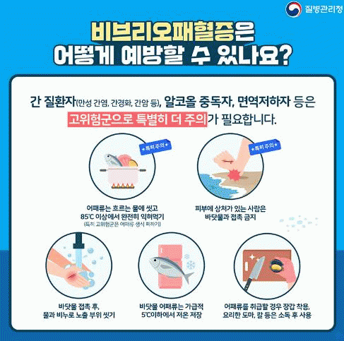 비브리오패혈증을 예방하기 위해서 ▲올바른 손씻기 ▲ 바닷물 어패류는 5℃이하에서 저온 저장하기 ▲어패류는 흐르는 물에 씻고 85℃이상에서 완전히 익혀먹기 ▲어패류를 조리한 도마, 칼 등은 반드시 소독 후 사용하기 ▲피부에 상처가 있는 사람은 바닷물과 접촉하지 않기 등 예방수칙을 준수해야 한다.