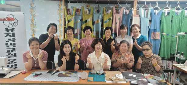 특별히 공방교실 프로그램 수강생들은 지역 봉사활동의 주축을 이루는 새마을부녀회원들께 손수 제작한 앞치마를 선물해 주기로 의견을 모아 평일에도 모여 앞치마를 제단하고 바느질해 15벌의 앞치마를 추가로 제작했다.