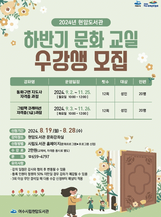 수강 희망자는 8월 19일부터 28일까지 여수시립도서관 누리집을 통해 신청하면 된다.