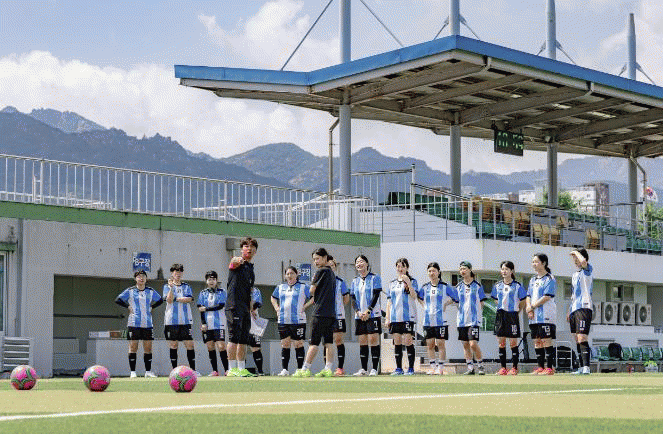 이들은 하늘색과 흰색 세로 줄무늬가 교차하는 상의, 검정색 반바지와 스타킹으로 푸른 잔디 구장을 금세 알록달록하게 바꿔 놓았다. 유니폼 왼쪽 가슴에는 녹색·흰색 바탕의 방패 위로 ‘달차녀 FC’ 글씨가 선명했다.