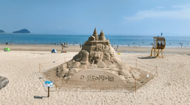 모래조각 작품은 백사장 중앙과 완도해양치유센터 입구에 ‘인어공주의 성’, 완도해양치유센터 옆 이벤트 광장에는 ‘바다를 품은 마린 보이’가 8월 초 완성돼 포토존으로 자리 잡았다.
